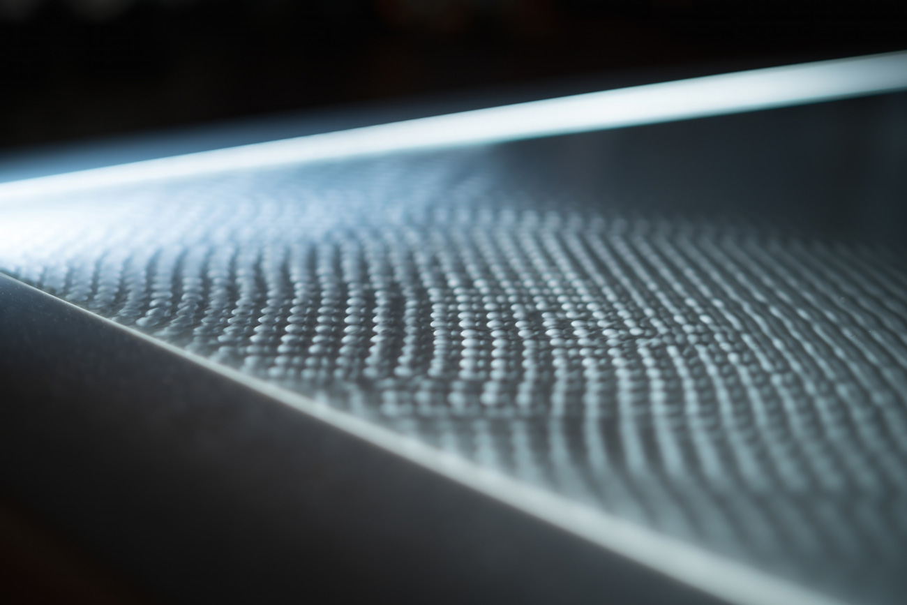 Diffusore in solid surface Krion by Porcellanosa® con guida d’onda. Suono omni direzionale naturale che si espande uniformemente nello spazio.