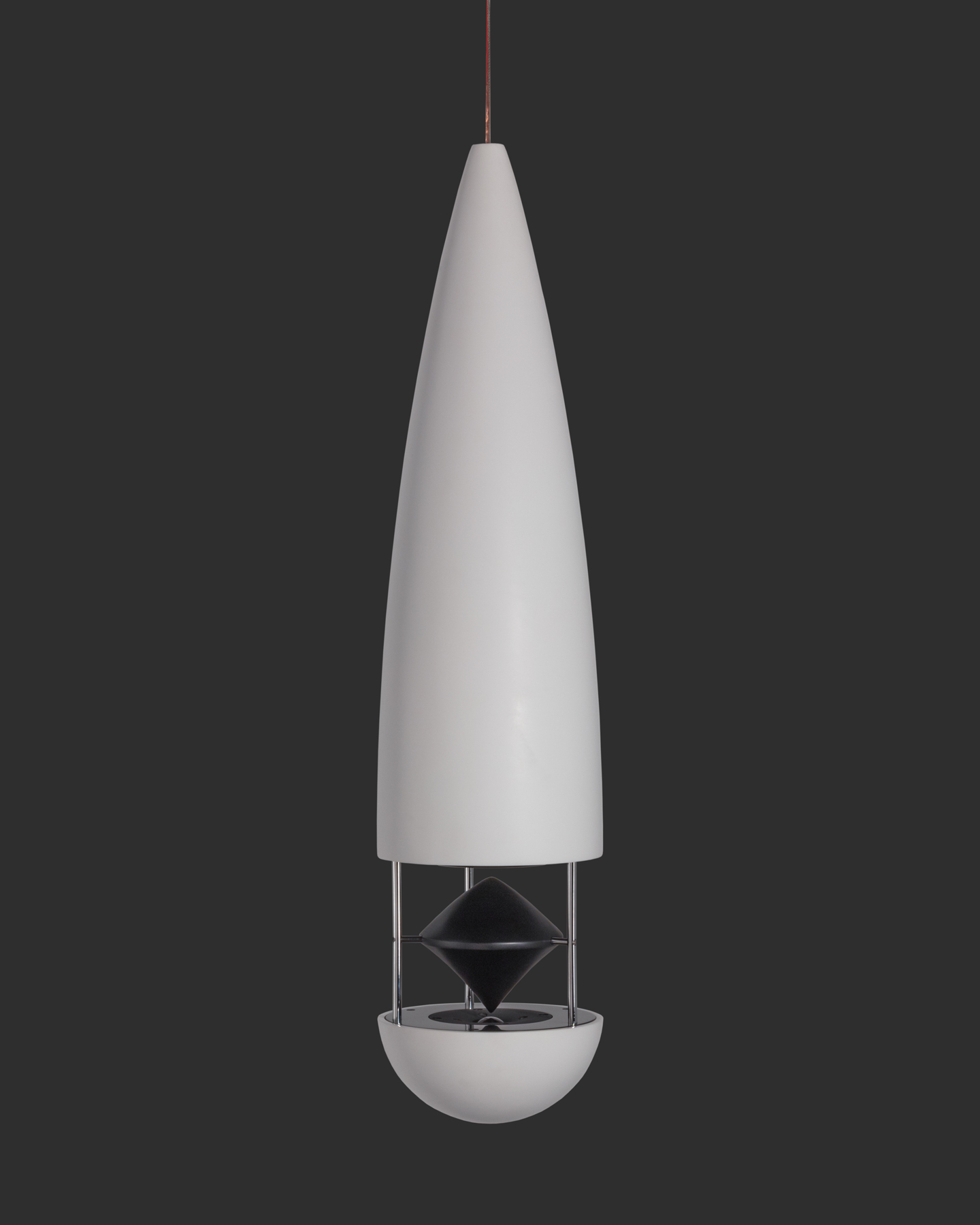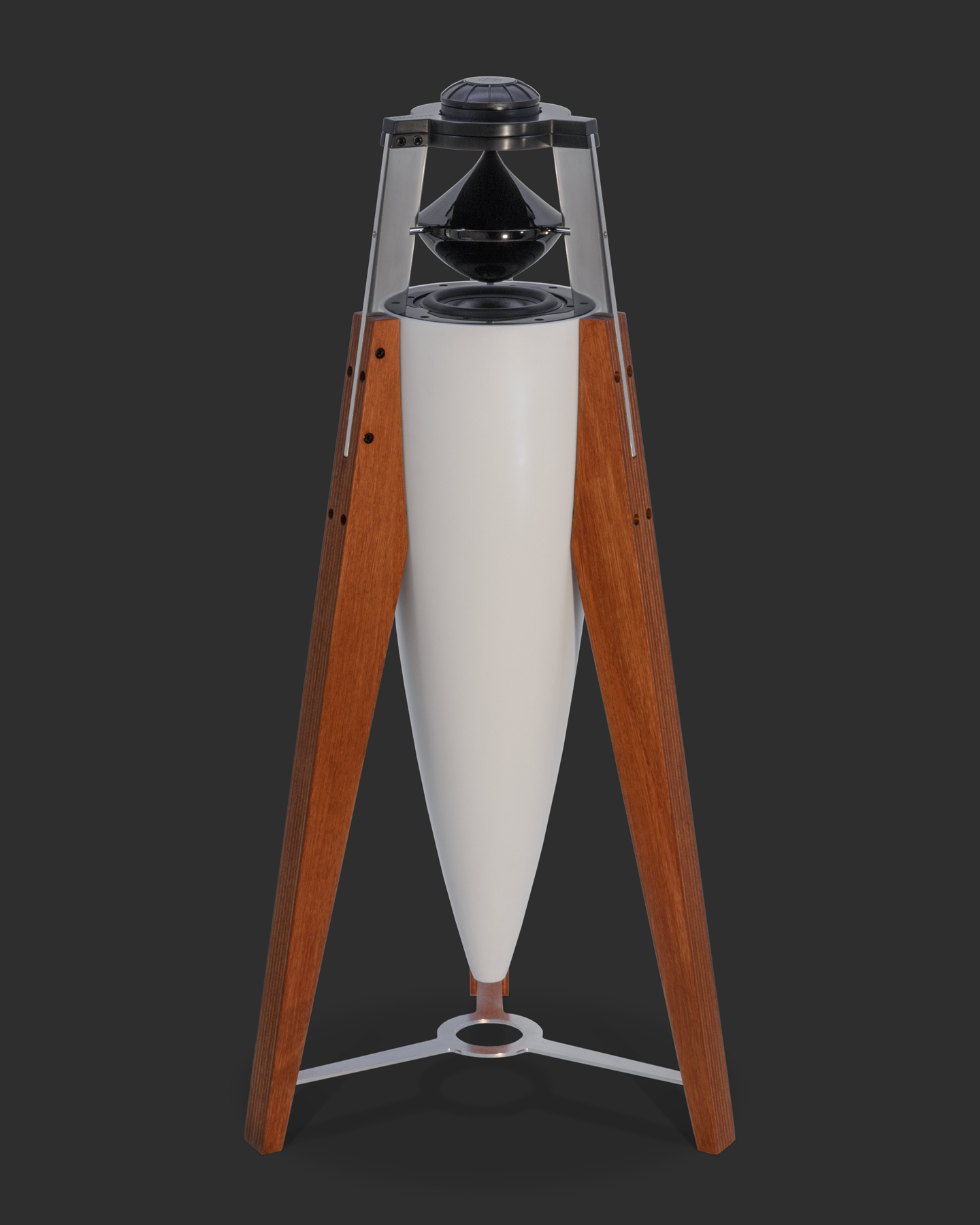 Scultura acustica verticale in Solid Surface Krion. Centocinquanta watt, tweeter Scan-Speak, suono tridimensionale naturale che sorprende con presenza e precisione assoluta.
